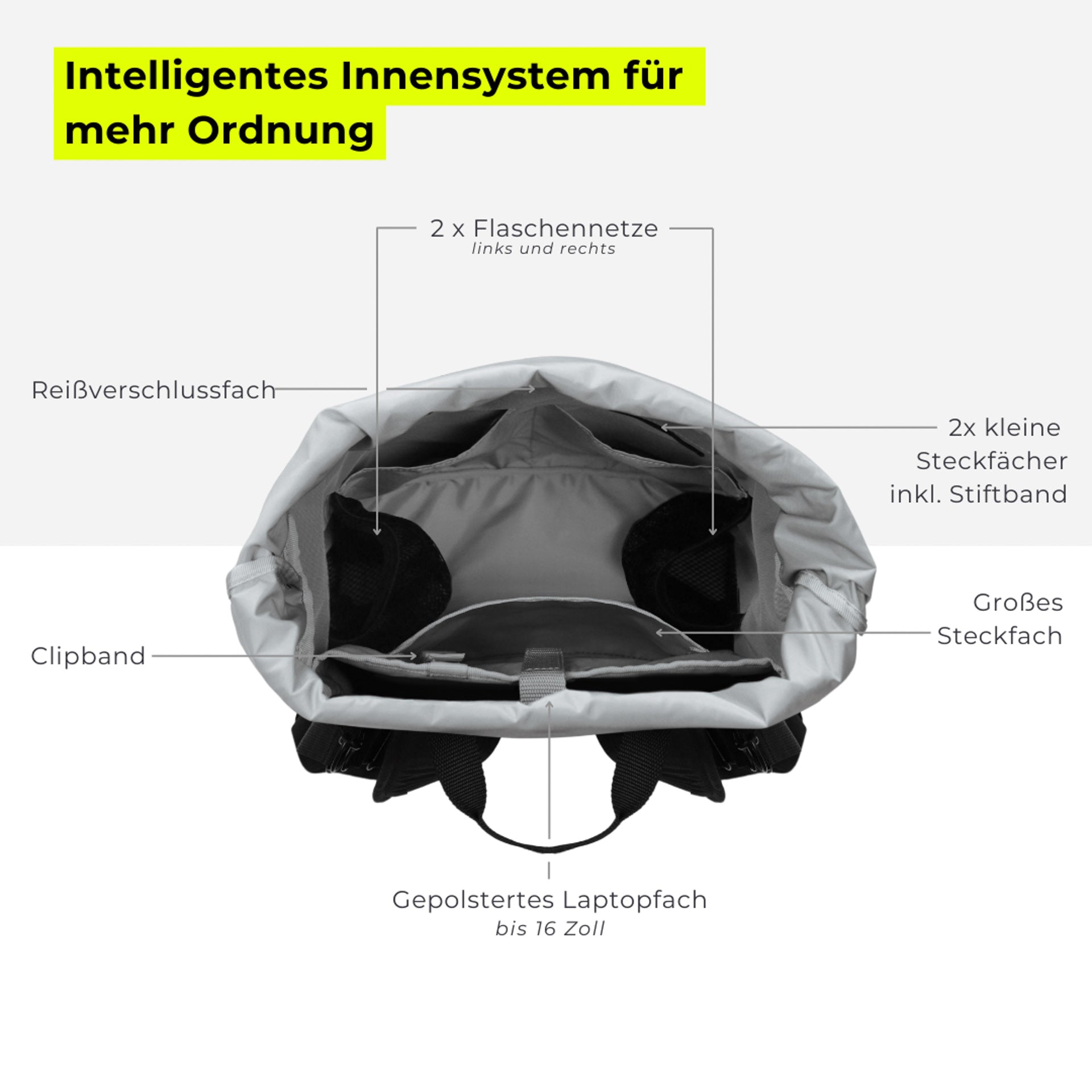 Inside: Light grey washable lining, two slip pockets, 1 zip pocket, spoon and pen holder, clip strap (e.g. for pacifier) and bottle compartment, padded laptop compartment (up to 16 inches).